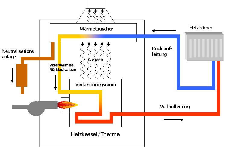 Der Brenner erwärmt durch die Öl-/Gasflamme den Heizkessel. Die dabei entstandenen Heizgase steigen auf und kondensieren im Wärmetauscher. Dabei geben sie Wärme an das kalte Rücklaufwasser ab. Der Brenner benötigt nun weniger Energie um das Rücklaufwasser vollständig zu erhitzten. Das Kesselwasser speist dann die Wärme in den Wasserkreislauf des jeweiligen Heizungssystems. Mit dem nun abgekühlten Wasser können wiederum die Abgase gekühlt und kondensiert werden. So ist die Energieausnutzung vor allem in den Wintermonaten optimal.